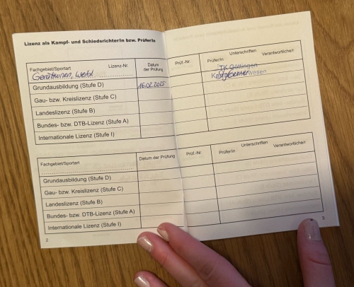 Die beiden jungen Frauen haben an einem Lehrgang in Göttingen am 25. und 26. Januar und am 15. und 16. Februar 2025 die Kenntnisse zum Erwerb des Kampfrichter D-Scheins erworben. Kursleiterin war Constance Stegbauer vom NTB.