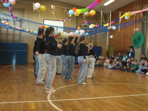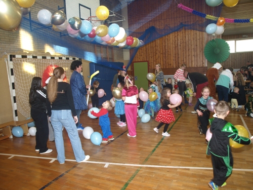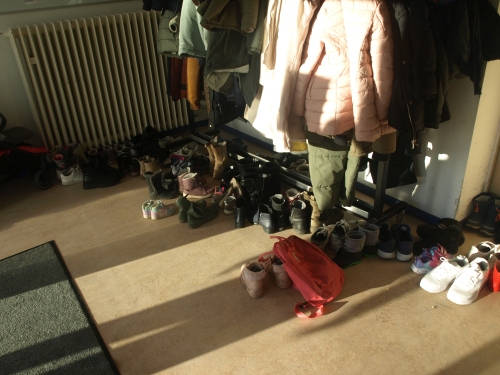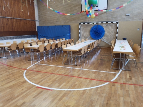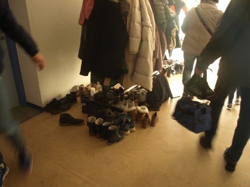Die Kinder hatten natürlich Hallenschuhe an. Die Erwachsenen zogen ihre Straßenschuhe vor der Turnhalle aus, damit das Parkett nicht beschädigt wird.
