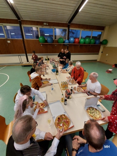 Die engagierte Helferschar hatte Pizza bestellt. So saß die Gruppe noch eine gute Zeit zusammen, um sich über die gelungene Veranstaltung zu freuen.