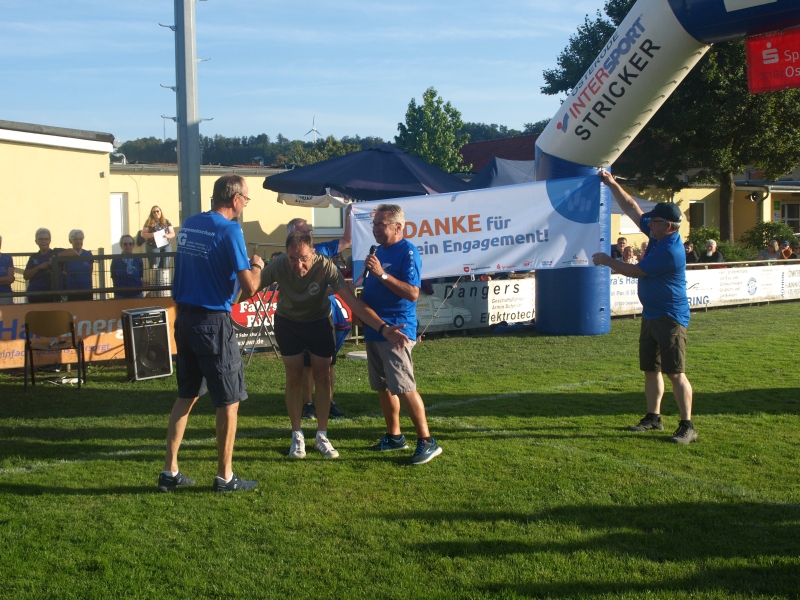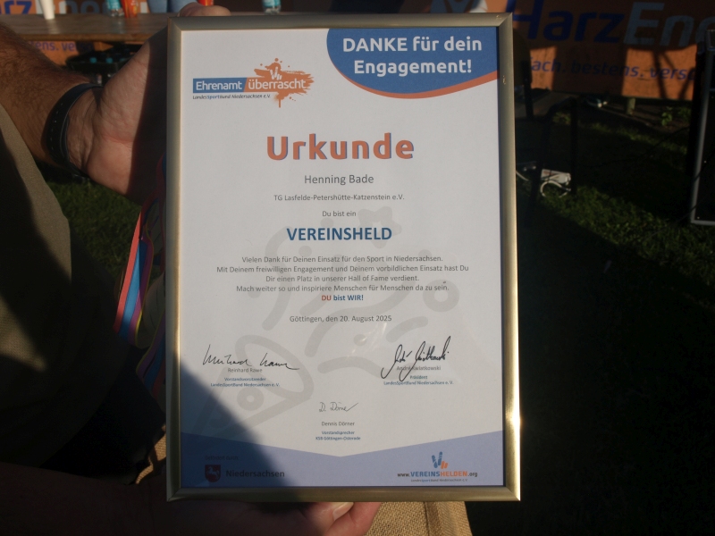 Beim Landessportbund Niedersachsen gibt es auch in diesem Jahr eine Initiative "Ehrenamt überrascht". Dabei werden in niedersächsischen Sportvereinen freiwillig und ehrenamtlich Engagierte mit einer besonderen Aktion überrascht. Ziel der Aktion ist, für mehr Anerkennung und Wertschätzung für freiwillig und ehrenamtlich Engagierte zu sensibilisieren und diese aktiv zu leben. Der Vorstand der TG hatte Hans-Henning Bade für diese Ehrung nominiert. Er überraschte Henning kurz vorm Start der Etappen-Marathon-Etappe in Lasfelde am Mittwoch, den 20. August 2025 mit dieser Ehrung.