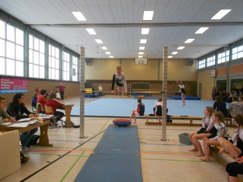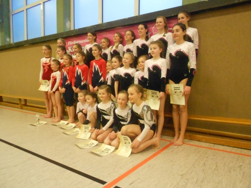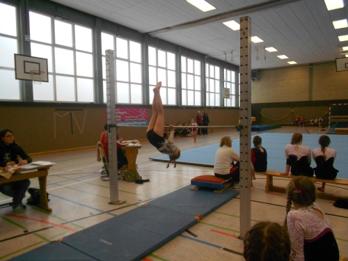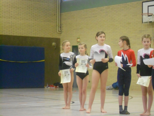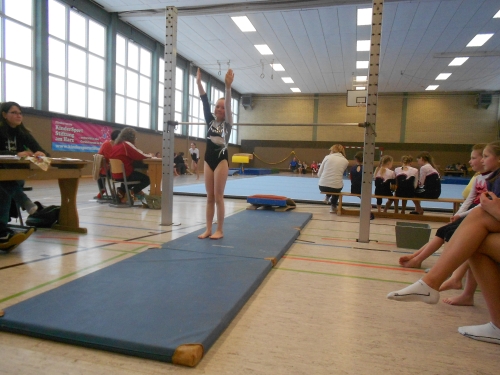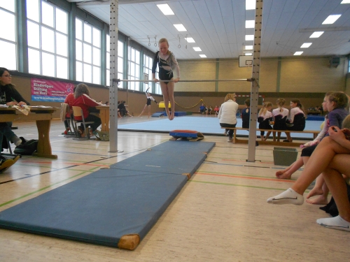 Marie Steinbrück ging mit der nötigen Ruhe in ihren Wettkampf. Sie turnte solide und ohne Patzer alle Geräte durch. Am Ende belegte sie mit 47,85 Punkten den 11. Platz. Für Sarah Henkel und Celina Kohlrausch waren es die ersten Kreismeisterschaften. Celina startete ohne große Probleme ihren Wettkampf und hatte nur am Schwebebalken eine kleinen Hänger. In der Endabrechnung langte es trotzdem und sie belegte mit 48,25 Punkten den 3. Platz. Sarah Henkel hatte sich im Training beim Schwebebalken verletzt und brauchte so etwas länger um wieder sich mit dem Gerät anzufreunden. In der Bodenübung lies sie ein Übungsteil aus, das ihr in der Endabrechnung weniger Punkte als Marie einbrachte. Am Reck und beim Sprung zeigte sie gute Leistungen und schöne Übungen. Sie belegte mit 45,75 Punkten den 11. Platz. Alle Kinder fuhren nach einem spannenden Nachmittag zufrieden nach Haus.