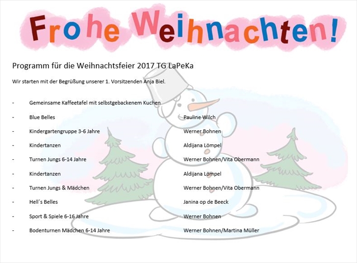 Alle Kinderturngruppen, die Werner betreut, trugen zum Gelingen bei. Am Vormittag um halb zehn trafen sich etliche Helfer, um die Halle für die Veranstaltung vorzubereiten: Weihnachtsbaum aufstellen und schmücken, Theke für das Kuchenbuffet aufbauen, einen Teil des Hallenbodens mit Auslegware schützen, im hinteren Hallenteil Tische und Stühle aufstellen usw.
