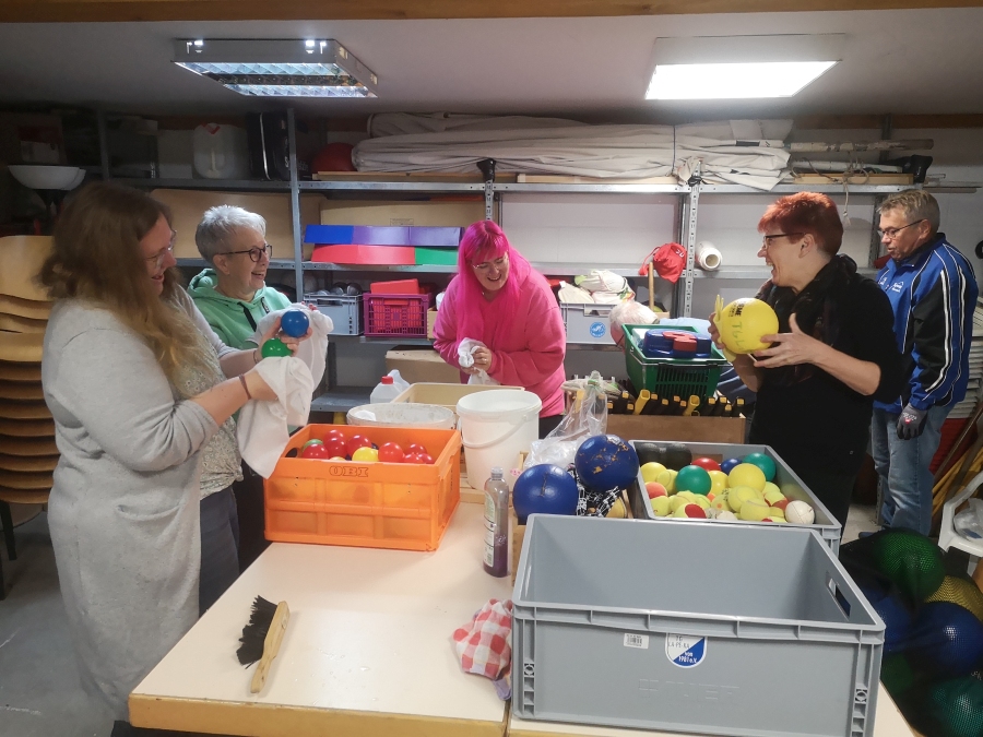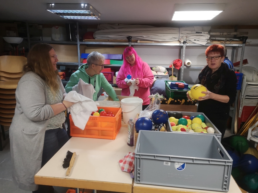 In den Herbstferien am 15. Oktober 2024 trafen sich einige TG-Mitglieder zum "Putztag". Im Wesentlichen ging es darum im Geräteraum der TG aufzuräumen und nicht mehr benötigte Sport- und Spielgeräte neuen Zwecken zuzuführen. Wichtig war, dass Sportlehrer Werner Bohnen, der etliche Kindergruppen betreut, und Kristina Kaufeld, Übungsleiterin beim Eltern- und Kindturnen, dabei waren, damit nicht wichtige Utensilien ungeprüft die Turnhalle und den Geräteraum verlassen.