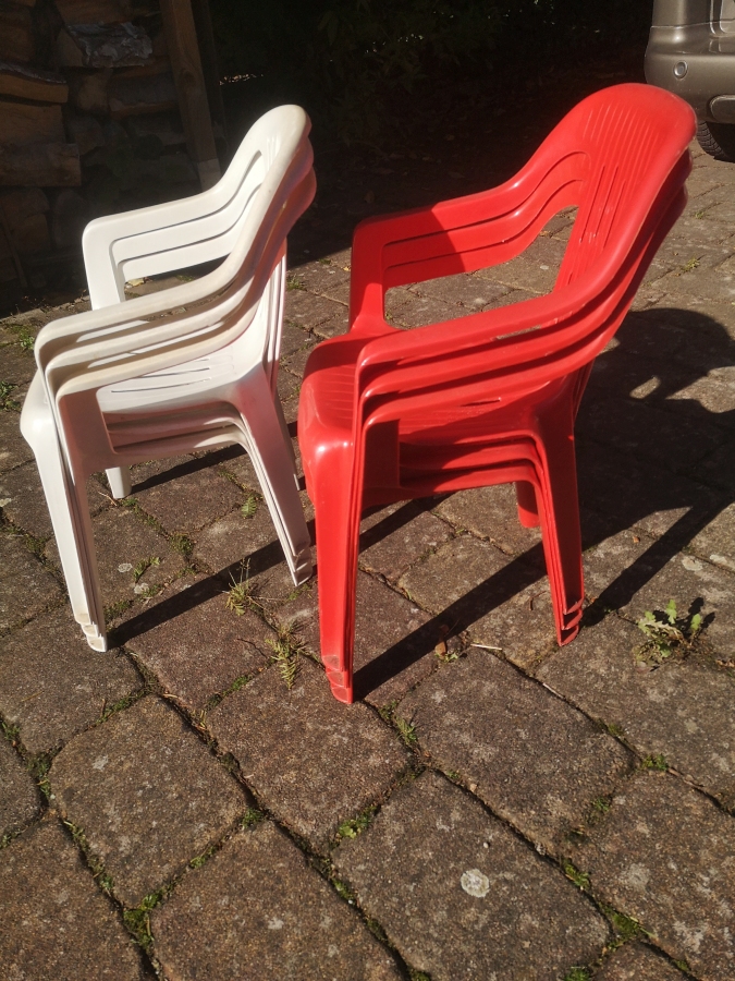 Die Hocker wurden auf zwei Stapel zusammengeräumt.
